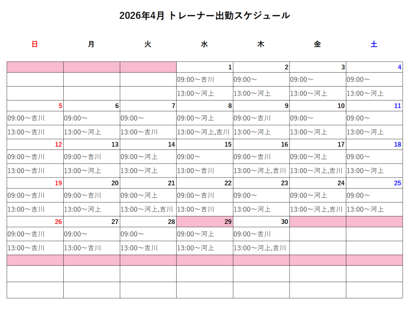 ※パーソナルトレーニングのご予約は埋まっている場合やトレーナーの出勤状況に変更がある場合がございますので、ジムマイページをご確認ください。